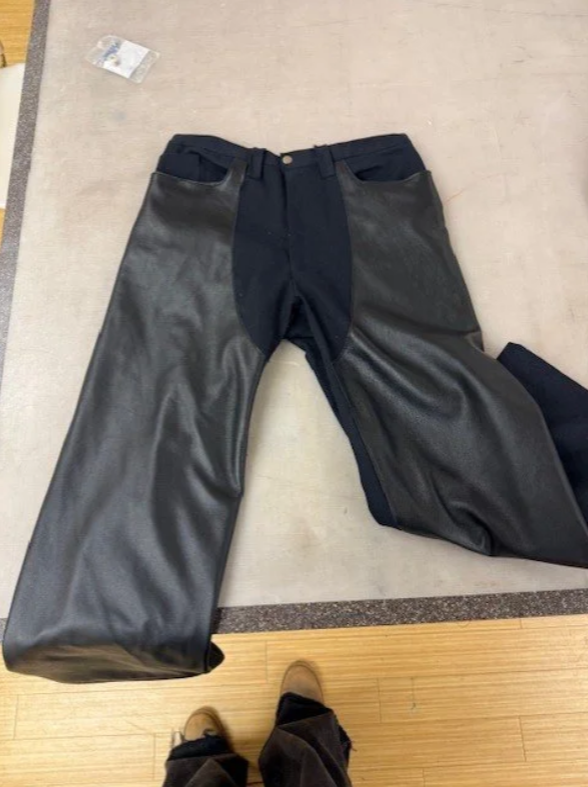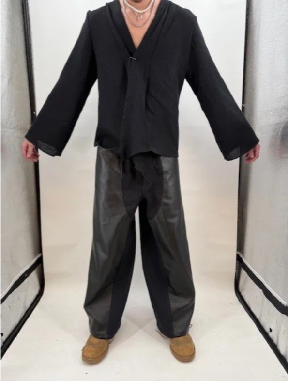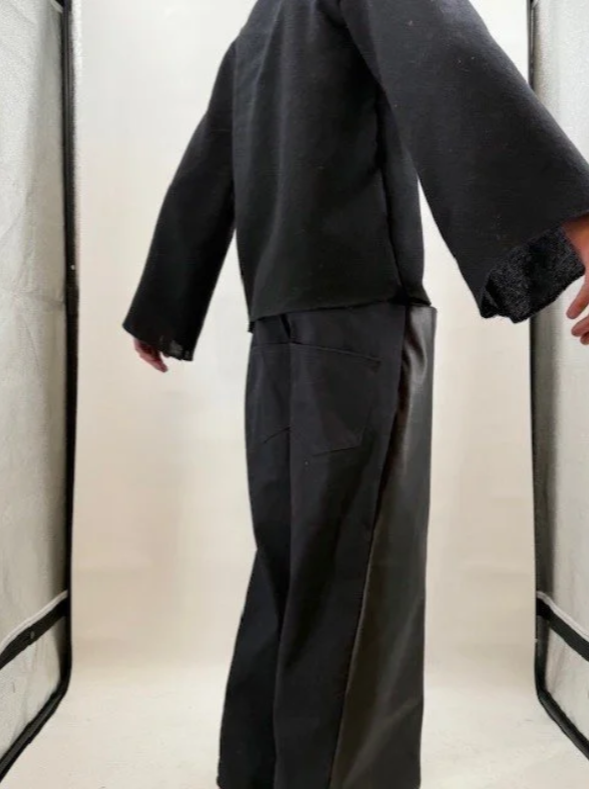 Exploration of denim x leather for a future cowboy design. Designed / Patterned With CLO 3D, constructed with walking foot leather machine. Featuring a thin wool pleated top.